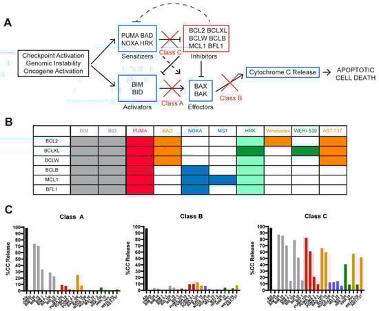 BH3 profiling assay: rationale and methodology. (Adapted from Deng et al. [16]). (A) Anti-apoptotic BCL2 family members inhibit the mitochondrial apoptotic pathway. Upon oncogene activation or cellular damage, activator and/or sensitizer proteins are upregulated, which allows BAX and BAK to oligomerize, leading to cytochrome c release, which results in apoptotic cell death. Anti-apoptotic BCL2 family members inhibit pro-apoptotic and sensitizer proteins, preventing BAX and BAK from inducing mitochondrial outer membrane polarization (MOMP), the commitment to apoptosis. (B) Pattern of interaction between the anti-apoptotic proteins (rows) present in cells and the pro-apoptotic synthetic peptides or drugs (columns) used in the BH3 profiling assay. PUMA (illustrated by red columns) inhibits all the inhibitors and is a pan-sensitizer, as well as contributing to BAX and BAK activation. Orange colors indicate peptides that inhibit the BCL2 protein with venetoclax inhibiting only BCL2 whereas BAD and ABT-737 inhibit BCL2, BCLXL, and BCLW. Blue columns are used to highlight mantle cell lymphoma (MCL)1-dependence where MS1 specifically inhibits MCL1, whereas NOXA inhibits BCLB, MCL1 and BFL1. Green columns indicate BCL-XL-dependence where WEHI-539 only inhibits BCLXL and HRK is mainly a BCL-XL inhibitor but can also inhibit other anti-apoptotic proteins with lower affinities, including BCL2. (C) BH3 profiles are illustrated in graphical form with % of the cells undergoing cytochrome c release on the Y axis after exposure to each drug/peptide on the X axis. Alamethecin (ALA) is a control that induces cytochrome c release in all cells independent of BAX or BAK. DMSO is the negative vehicle control because it does not induce cytochrome c release. Representative samples from our cohort were used to demonstrate different classes of apoptotic block. This high-grade B cell lymphoma with translocations in MYC and BCL2 (HGBL-DH) sample shows a class A block, where cells were competent to undergo apoptosis (i.e., functional BAX/BAK) because exogenous activators BIM and BID could induce MOMP (grey bars). Two diffuse large B-cell lymphoma (DLBCL) samples shown here represent a class B and C BH3 profile. In class B blocks, cells fail to undergo MOMP upon exposure to BIM or BID BH3 synthetic peptides, indicating that there is no functional BAX or BAK, and are incompetent for undergoing apoptosis through the mitochondrial pathway. In class C blocks, cells are competent to undergo apoptosis (grey BIM/BID), primed (red PUMA) and depend mainly on BCL2 (orange bars).