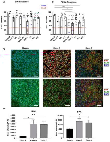 Competency and priming of the mitochondrial pathway according to lymphoma subtype. We measured cytochrome c release, displayed on the y-axis, after exposure to 100 μM of BIM (A) and 100 μM of PUMA (B) peptides in different untreated lymphoma subsets (10 frozen blood B, 14 tonsil B, 16 chronic lymphocytic leukemia (CLL), 11 small lymphocytic leukemia (SLL), 7 high-grade B cell lymphomas with translocations in MYC and BCL2 (HGBL-DH), 30 DLBCL, 38 follicular lymphoma (FL), 12 mantle cell lymphoma (MCL), 10 marginal zone lymphoma (MZL)). For BIM, we defined a threshold of <30% as having a class B block, i.e., having dysfunctional BAX or BAK. For PUMA, we defined a threshold of <30% as being unprimed. Red dashed lines highlight the 30% cut-off, with samples below this threshold being class A/B apoptotic blocks. Class A block samples are in blue and class B block samples are in red. Dots represent individual samples, bars represent the mean ± standard error of the mean (SEM). A one-way ANOVA with Tukey multiple comparison was used to determine statistical significance between non-Hodgkin lymphoma (NHL) subtypes. Only comparison to DLBCL was determined to be significantly different in BIM response. DLBCL samples are less primed than other NHL and high-grade lymphomas have a higher percentage of class A/B blocks. * p < 0.05, ** p < 0.01, *** p < 0.001. (C) Representative merged IF stains at 20× for DAPI (blue), PAX5 (green, AF594) and BIM/BAX (red, AF647) in class A, B, and C DLBCL samples. Scale bars represent 50 µm. (D) Quantification of the mean pixel intensity across all classes of apoptotic block in DLBCL. Samples were analyzed using Qupath software and t-test with Welch’s correction was used to compare columns, bars represent the mean ± standard error of the mean (SEM). * p < 0.05, ** p < 0.01. Class A samples may have decreased expression of BIM and possibly BAX compared to Class B and C samples.
