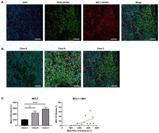 Expression of MCL1 in DLBCL by immunofluorescence. (A) Representative 20× single channel images of DAPI (blue), PAX5 (green, AF594), and MCL1 (red, AF647), as well as a merged image, in a class C sample. Scale bars represent 50 µm. (B) Qualitative comparison of MCL1 expression in class A, B, and C samples. The same sample from panel A is used in this panel. PAX5 staining was weak in class A when co-stained with MCL1, but this tissue was confirmed to be PAX5 positive in previous stains. Scale bars represent 50 µm. (C) The mean pixel intensity of all samples in each class, as calculated by Qupath. T-test with Welch’s correction was used to compare columns, bars represent the mean ± standard error of the mean (SEM). Spearman linear regression analysis was applied to analyze the correlation between cytochrome c release to MS1 (10 µM) and mean MCL1 intensity (R2 = 0.3525). Dot colors represent class of sample: A (blue), B (red), C (green). Response was only seen in class C samples with high MCL1 expression and mean MCL1 expression was lower in Class A/B samples * p < 0.05, *** p < 0.001.