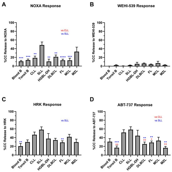 BCLXL and other anti-apoptotic protein dependency. Graphs show cytochrome c release after 90-min exposure to 100 μM of NOXA (A), 1 μM of ABT-737 (B), 1 μM of WEHI-539 (C), and 100μM of HRK (D) in all NHL subtypes. Bars measure the mean of all samples; error bars indicate standard error of the mean (SEM). A one-way ANOVA with Tukey multiple comparison was used to determine statistical significance between subtypes. NHLs respond poorly to the singular inhibition of anti-apoptotic proteins but respond better when multiple proteins are targeted. BCLXL contributes only modestly to cell survival in our cohort. * p < 0.05, ** p < 0.01, *** p < 0.001, **** p < 0.0001.