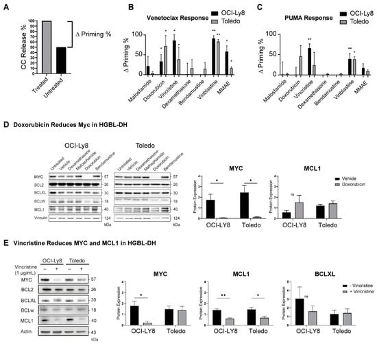 Dynamic BH3 profiling performed in Toledo and OCI-Ly8 cell lines. The % of untreated cells undergoing cytochrome c release was subtracted from the % of cells undergoing cytochrome c release in treated samples to determine an increase in release named “Δ Priming” (example shown in panel (A)). Cytochrome c release was measured in cells upon exposure to 1 µM of venetoclax (B) and 1 µM PUMA (C) after a 17 h incubation with dimethyl sulfoxide (control) and different drugs. Welch’s t tests were used to compare individual treatments to the individual control groups. Microtubule targeting components of RCHOP such as doxorubicin and vincristine increased cells priming and sensitivity to venetoclax. *p < 0.05, **p < 0.01. (D) Western blot measuring anti-apoptotic protein and MYC levels in OCI-Ly8 and Toledo cell lines after 17 h treatment with dexamethasone, mafosphamide, doxorubicin, and bendamustine. Doxorubicin significantly decreases the expression of MYC in both cell lines after treatment. (E) Western blot measuring anti-apoptotic protein and MYC levels in OCI-Ly8 and Toledo cell lines after 17 h treatment with vincristine. Bars measure the mean of all samples, error bars indicate SEM. Vincristine significantly reduces MCL1 expression in both cell lines while also reducing MYC expression in OCI-LY8. BCLXL was not significantly reduced after treatment with vincristine. * p < 0.05, ** p < 0.01. ns, non-significant.