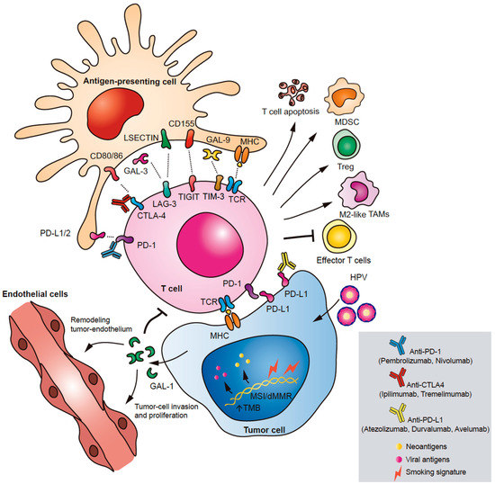 Immune checkpoints in head and neck squamous cell carcinoma (HNSCC). The main immune checkpoint pathways involved in HNSCC immune escape are illustrated: PD-1/PD-L1, CTLA-4, TIM-3, LAG-3, and TIGIT. Through different molecular mechanisms and signaling pathways, immune checkpoint molecules promote apoptosis of T cells, inhibit the effector function of T cells, and induce expansion of immunosuppressive MDSCs, M2-like TAMs, and Tregs. A novel soluble immune checkpoint implicated in HNSCC is Gal-1. Gal-1 is expressed by tumor cells triggering immune escape, modulation of tumor endothelium, and metastasis.