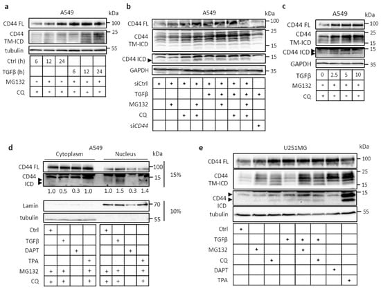 Transforming growth factor β (TGFβ) induces ectodomain and intramembranous cleavage of CD44 in a dose- and time-dependent manners. (a,b) Immunoblot analysis of full-length (FL) and cleavage products (transmembrane and intracellular domain (TM-ICD) and ICD) of CD44 in A549 cells after treatment or no treatment with TGFβ (5 ng/mL) for the indicated time periods; knockdown of CD44 by siRNA was performed to confirm the specificity of observed bands (b). (c) Immunoblotting of FL CD44, as well as the TM-ICD and ICD of CD44 after 24 h of treatment with different concentrations of TGFβ. (d), A549 cells treated or not with TGFβ (5 ng/ml), DAPT (40 μM), MG132 and CQ for 24 h, or TPA (80 nM) for 1 h, were subjected to nuclear/cytoplasmic fractionation and subjected to SDS gel electrophoresis in 15% or 10% polyacrylamide gels, followed by immunoblotting for FL, ICD of CD44, lamin, and tubulin. Quantification of CD44-ICD bands was performed via ImageJ after normalizing to CD44 FL (e), Immunoblot analysis of FL CD44, as well as the TM-ICD and ICD of CD44 in U251MG cells treated or not treated with TGFβ for 24 h, or 12-O-tetradecanoylphorbol-13-acetate (TPA) (80 nM) for 1 h. The cultures were treated with the γ-secretase inhibitor DAPT (40 μM)), the proteasomal inhibitor MG132, and the lysosomal inhibitor chloroquine (CQ) for 24 h; tubulin or glyceraldehyde 3-phosphate dehydrogenase (GAPDH) were used as loading controls in the same immunoblots. Arrowheads indicate CD44 ICD-like products.