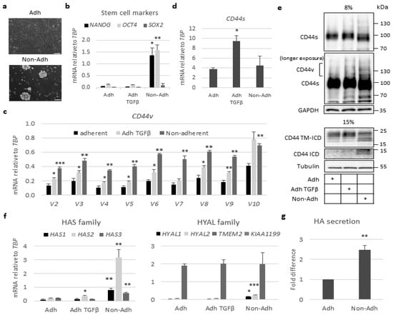 The expression of CD44v isoforms is linked to tumor growth, metastasis, and stemness [35], and importantly, CD44v isoforms exhibit increased proteolytic cleavage compared with CD44s in tumors [47]. CD44v6 is a biomarker associated with colon cancer stemness and tumor progression [51,52], and hyaluronan-engaged CD44v3 induces the expression of stem cell markers, NANOG, SOX2, and OCT4, promoting tumor progression and chemoresistance of head and neck squamous cell carcinomas [18,53]. Consistent with these observations, we found that CD44v isoforms are overexpressed in A549 cells grown as spheres and enriched for stemness markers, such as NANOG and OCT4 (Figure 2). We also found that A549 cells grown in spheres overexpress HAS2 and secrete more hyaluronan than cells grown under adhesive conditions (Figure 2f,g). Interestingly, hyaluronan synthesis was found to be increased in spheroids compared to adherent cultures of malignant mesothelioma [54]. These observations are consistent with the possibility that hyaluronan contributes to the stem cell niche [55].