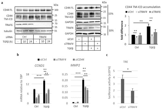 The expression of cyclin D1 (CCND1) and MMP2 have been shown to be dependent on CD44 [21,38,39]. We found that knockdown of TRAF4 in A549 cells suppressed the TGFβ-induced expression of CCND1, as well as MMP2, as did knockdown of CD44 (Figure 3b). TRAF4 and CD44 silencing efficiency is depicted in Figure S4d. The translocation of CD44 ICD to the nucleus has been shown to promote activation of the TPA-responsive element (TRE) luciferase reporter [19]; knockdown of TRAF4 reduced the activation of the TRE reporter by 50% (Figure 3c). The results support the notion that TRAF4 is important for CD44 signaling in A549 cells.