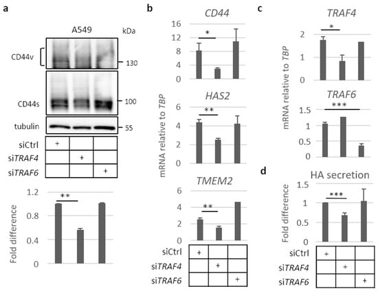 We analyzed the importance of TRAF4 and TRAF6 for the expression of CD44s and CD44v, and mRNAs for CD44, HAS2, and the hyaluronidase TMEM2 in A549 cell spheres. We found that silencing of TRAF4 by siRNA, but not the silencing of TRAF6, led to about a 40% reduction in the expression of the CD44s isoform (Figure 4a). Furthermore, the expression of mRNAs for CD44, HAS2, and TMEM2 was suppressed after silencing of TRAF4 (Figure 4b,c), resulting in a 30% decrease in hyaluronan production (Figure 4d). In contrast, knockdown of TRAF6 did not significantly affect the expression of CD44, HAS2, or TMEM2, or the level of secreted hyaluronan (Figure 4b,d, respectively).