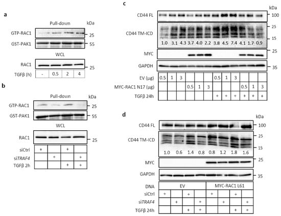 To further address the mechanisms regulating signaling via CD44 and TRAF4, we investigated the involvement of the small GTPase RAC1, which has been demonstrated to promote the cleavage of CD44 in TPA- [12] or EGF-stimulated [40] U251MG cells. TGFβ stimulation of A549 cells activated RAC1, first observed after 30 min and sustained over several hours, as demonstrated by the pull-down of GTP-RAC1 by glutathione S-transfarase-tagged p21-activated kinase (GST-PAK1) (Figure 5a). Silencing of TRAF4 by siRNA inhibited the activation of RAC1 (Figure 5b). Transfection of a dominant-negative RAC1 mutant (MYC-RAC1 T17N) suppressed the TGFβ-induced formation of CD44 TM-ICD (Figure 5c), as did knockdown of TRAF4 (Figure 5d). In contrast, transfection of a constitutively active RAC1 mutant (MYC-RAC1 Q61L) rescued the formation of CD44 TM-ICD, in the absence or presence of TGFβ (Figure 5d). A similar dependence on TRAF4 for RAC1 activation was also observed in H1299 cells (Figure S5). Moreover, TGFβ-mediated cleavage of CD44 was suppressed by the dominant-negative mutant MYC-RAC1 N17 (Figure S5c).