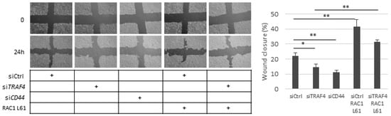 In order to determine if CD44-mediated migration of A549 cells requires TRAF4 and RAC1, we employed a cell culture scratch assay. The silencing of either CD44 or TRAF4 decreased the migration of A549 cells significantly; ectopic expression of the constitutively active RAC1 L61 rescued the migration of TRAF4-depleted cells and enhanced the migration of control cells (Figure 6). This observation suggests that the TRAF4–RAC1 axis might be important for CD44-dependent A549 cell motility. The migration of H1299 cells was significantly reduced by knockdown of CD44; a reduced migration, albeit not significant, was also observed in TRAF4-depleted cells, probably due to insufficient silencing efficiency (Figure S6).