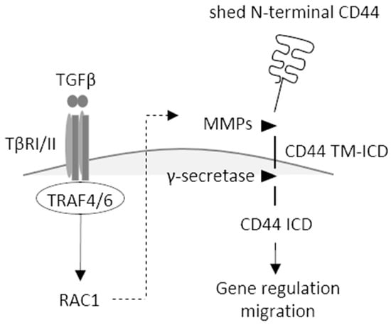 Schematic illustration of TGFβ-induced activation of TRAF4/6 and RAC1, leading to CD44 cleavage, enhanced migration, and altered gene regulation. Binding of TGFβ to its type II receptor (TβII) recruits and activates the type I receptor (TβRI), activating TRAF4/6 and RAC1, leading to the activation of MMPs, resulting in the formation of CD44 TM-ICD; after further processing by γ-secretase, CD44 ICD is translocated to the nucleus, where it regulates transcription and promotes cell migration.