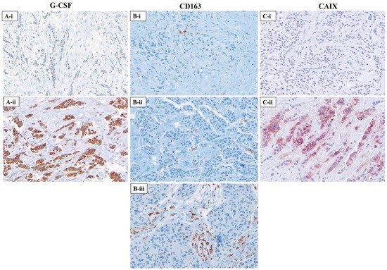 Representative photomicrographs for immunohistochemical staining of G-CSF, CD163, and carbonic anhydrase IX (CAIX) in breast carcinoma tissue microarray (cohort II) (Images acquired at 200X). (A) Cytoplasmic expression of G-CSF on breast carcinoma cells; (A-i) low (≤1); (A-ii) high (>1); (B) Membranous or cytoplasmic expression of CD163 on tumour-associated macrophages; (B-i) sparse infiltrates, ≤5 stained macrophages; (B-ii) moderate infiltrates, >5 but ≤25 positively stained macrophages; (B-iii) dense infiltrates, >25 positively stained macrophages; (C) Membranous expression of CAIX on breast carcinoma cells; (C-i) negative; (C-ii) positive.