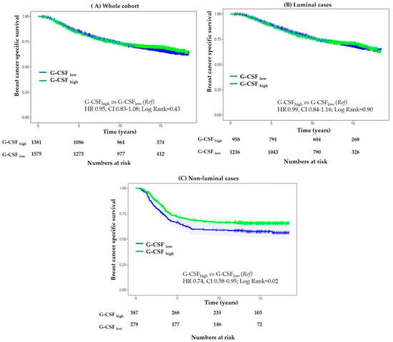 Cohort II: Kaplan–Meier curves: Association of G-CSF expression with breast cancer-specific survival (BCSS). No significant difference in BCSS was observed in the whole cohort (A) and cases with luminal subtype (B). An improved BCSS was observed in cases with non-luminal subtype (C).