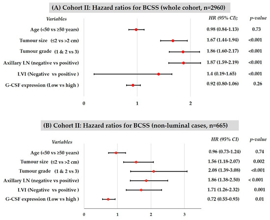Consistent with the univariate analysis, G-CSF expression was not an independent prognostic indicator in the whole cohort (n = 2960) using Cox proportional hazards model for multivariate analysis (HR 0.92, CI 0.80–1.06; p = 0.26). However, within the non-luminal cases (n = 665), G-CSFhigh tumours correlated with a 28% reduced risk of breast cancer-related deaths compared to G-CSFlow tumours, independent of the standard clinicopathological factors including age, tumour size, grade, lymphovascular invasion, and axillary lymph node metastasis (HR 0.72, CI 0.55–0.93; p = 0.01) (Figure 3). Within non-luminal subgroups, G-CSFhigh expression was significantly associated with better BCSS in HER2 subtype (n = 196); triple-negative subgroup (n = 469) and basal (n = 274) subgroups of non-luminal breast cancers did not generate hazard ratios that remained significant in multivariable analysis (data not shown).