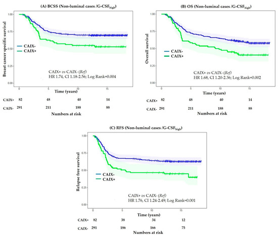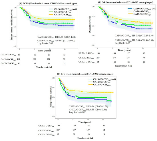 Non-luminal breast cancers contain regions of hypoxia and acidosis [47,48]. Preclinical studies have shown that G-CSF derived from the hypoxic tumour cells is crucial for mobilization of myeloid-derived suppressor cells to visceral organs, thus increasing the metastatic potential of breast cancer cells [22]. In line with this preclinical evidence, we observed a significant positive correlation between expression of G-CSF and CAIX (Table 1). Amongst non-luminal cases with a G-CSFhigh phenotype, significantly adverse BCSS (HR 1.74, CI 1.18–2.56; p = 0.004) was observed in CAIX-expressing tumours (Figure 4A). Similar results were observed for OS and RFS (Figure 4B,C), indicating that the expression of hypoxia-induced CAIX adversely impacted the prognosis of patients with non-luminal breast cancer with high tumoural expression of G-CSF. G-CSFhigh phenotype was associated with significantly better BCSS in CAIX-negative non-luminal cases expressing moderate to high CD163+M2 macrophages; however, no significant difference in survival was observed when analysis was restricted to CAIX-positive cases (Supplementary Figure S4).