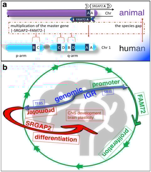 The human brain is a unique organ that can perform higher cognitive functions and is therefore different from all other species. Its uniqueness is reflected in the expression of four paralog gene pairs |-SRGAP2–FAM72-| (A–D) [1,2]. FAM72 is active in proliferating neural stem cells (NSCs) found in the brain hippocampus [1,2,3,4,5]. There are four specific FAM72 (A–D) paralogs associated with four respective SRGAP2 paralogs on human chromosome 1 (chr 1), but only one such gene pair co-exists as the |-SRGAP2–FAM72-| master gene in all other notochord containing vertebrates (Figure 1a) [1,2,6,7].