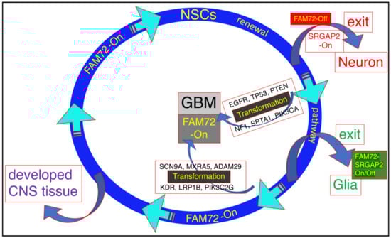 Overview of the |-SRGAP2–FAM72-| master gene expression in GBM [12]. As long as FAM72 remains in the on modus, NSCs keep proliferating. For neuronal differentiation and brain plasticity, FAM72 needs to be switched off to allow SRGAP2 activation and brain development. The activity of the |-SRGAP2–FAM72-| master gene expression during glia cell differentiation is less clear. Since glia cells have the capacity to proliferate, FAM72 might be switched on or off [13,14,15]. Eventually, mutations in GBM-specific driver genes: epidermal growth factor receptor (EGFR), tumor protein p53 (TP53), phosphatase and tensin homolog (PTEN), neurofibromin 1 (NF1), spectrin alpha, erythrocytic 1 (SPTA1) and phosphatidylinositol-4,5-bisphosphate 3-kinase catalytic subunit alpha (PIK3CA) or sodium voltage-gated channel alpha subunit 9 (SCN9A), matrix remodeling associated 5 (MXRA5), a disintegrin and metalloprotease domain 29 (ADAM29), kinase insert domain receptor (KDR), phosphatidylinositol-4-phosphate 3-kinase catalytic subunit type 2 gamma (PIK3C2G), and low-density lipoprotein receptor related protein 1B (LRP1B) induce NSC transformation into cancer stem cells (CSCs) while FAM72 is still in the on modus [12].