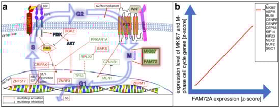 Experimental evidence-based schematic illustration of FAM72 and MKI67 co-activation in adrenocortical carcinoma (ACC). (a) Mutations in ACC-specific driver proto-onco- or tumor-suppressor-genes (red and green color) push the cell through the cell cycle and mediate MKI67 as well as FAM72 expression during the M-phase. Red-colored proto-oncogenes (or tumor-suppressor genes) are from Rahane et al. [28], while green-colored proto-oncogenes (or tumor-suppressor genes) are from Zheng et al. [29]; additional ACC-specific cell cycle information are from Assié et al. [30], Lippert et al. [31], and Pereira et al. [32]. Tumor suppressor LRIG1 interferes with EGFR signaling and might be a druggable protein of primary interest [33,34,35]. (b) Schematic illustration of mRNA expression correlation between FAM72A on the one hand and M-phase cell cycle genes, including MKI67, on the other hand. FAM72A expression correlates with the expression of cell cycle phase-specific genes across various human cancer tissue. Genes specifically associated with the late G2- to M-phase of the cell cycle, including ASPM, BUB1, CENPE, CENPF, CEP55, KIF14, KIF23, NEK2, NUF2, and SGO1 (ASPM, BUB1, CEP55, KIF14, KIF23, and NEK2 are involved either with spindle formation or with regulation; CENPE, CENPF, NUF2, and SGO1 are involved in the centromere-kinetochore complex) [12,28]. ASPM, Assembly factor for spindle microtubules; BUB1, Budding uninhibited by benzimidazoles 1 mitotic checkpoint serine/threonine kinase; CENPE, Centromere protein E; CENPF, Centromere protein F; CEP55, Centrosomal protein 55; CRIPAK, Cysteine-rich p21-activated protein kinase 1 inhibitor; CTNNB1, Catenin beta 1; DGKZ, Diacylglycerol kinase zeta; FZD, Frizzleds; GARS1, Glycyl-tRNA synthetase 1; KIF14/23, Kinesin family member 14/23; LRIG1, Leucine rich repeats and immunoglobulin-like domains 1; NEK2, Never in mitosis gene a-related kinase 2; NUF2, NUF2 component of NDC80 kinetochore complex; RPL22, Ribosomal protein L22; PRKAR1A, Protein kinase cAMP-dependent type I regulatory subunit alpha; RAS, Rat sarcoma; SGO1, Shugoshin 1; WNT1, Wingless and Int-1 family member 1; ZFPM1, Zinc finger protein, friend of GATA family member 1; ZNF517, Zinc finger protein 517; ZNRF3, Zinc and ring finger 3.