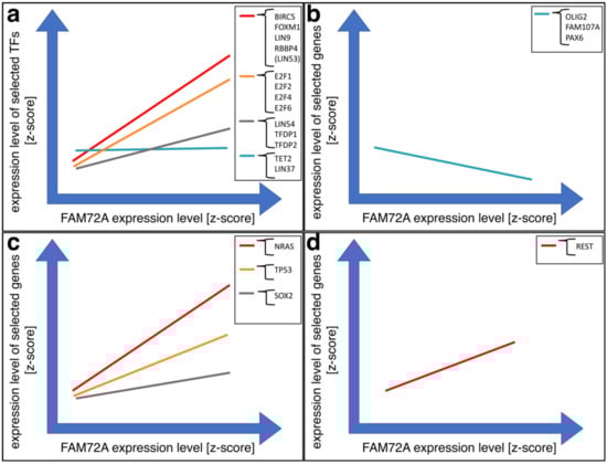 Schematic illustration of mRNA expression correlation of FAM72A compared with several other GBM-relevant genes, including E2Fx TFs. (a) FAM72A expression correlates with the expression of selected genes and TFs (Supplementary Materials Figures S2–S17). (b) FAM72A expression does not correlate with the expression of OLIG2, FAM107A nor with PAX6 (Supplementary Materials Figures S7, S12, and S13). (c) FAM72A expression correlates with neuroblastoma rat sarcoma proto-oncogene (NRAS), TP53, and weakly with sex determining region Y (SRY) box transcription factor 2 (SOX2) in glioma (Supplementary Materials Figures S18–S20). (d) FAM72A expression correlates with RE1 silencing transcription factor (REST) in glioma (Supplementary Materials Figure S21).