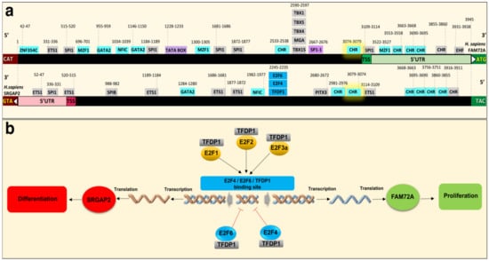 To further understand the mechanism of IGR-controlled |-SRGAP2–FAM72-| master gene expression, we performed bioinformatic analysis of TFBSs on the IGR (Figure 5a) [54]. The predicted TFBSs appear to partly explain our questions raised based on their ability to control the cell cycle and transcription regulation of this |-SRGAP2–FAM72-| master gene pair via its IGR. Specifically, we discovered E2F4, E2F6, and TFDP1 TFBSs present on the IGRs of the |-SRGAP2–FAM72A-|, |-SRGAP2C–FAM72B-|, |-SRGAP2D–FAM72C-|, and |-SRGAP2B–FAM72D-| gene pairs (Figure 5a,b). This indicates the participation of a heterodimeric E2Fx/TFDP1 complex, which may contribute to the divergent gene transcription control of FAM72A and SRGAP2, respectively (Figure 5a,b). The E2Fx family is known to consist of TF members, which all play important roles in the cell cycle control. The E2F4/E2F6/TFDP1 predicted sites on the IGR are assumed as binding sites for E2Fx family members with both gene activation or repression abilities [55,56,57]. Interchangeable roles of E2Fx family members were revealed by a comprehensive ChIP analysis of E2F1 (e.g., E2F1-3a activators), E2F4 (e.g., E2F4-5 canonical repressors), and E2F6 (e.g., E2F6-8 atypical repressors) in normal and tumor cells [55], while loss of one E2F member could cause a function compensation by the other E2Fs to ensure cell cycle operation [58,59]. Specifically, E2F6 encodes a member of a family of TFs that plays a crucial role in the control of the cell cycle, of which the protein lacks the transactivation and tumor suppressor protein association domains found in other E2Fx family members, and it contains a modular suppression domain that functions in the inhibition of transcription. It interacts in a complex with chromatin modifying factors. Moreover, TFDP1 encodes a member of a family of TFs that heterodimerize with E2Fx proteins to enhance their DNA-binding activity and promote transcription from E2Fx target genes. The encoded protein functions as part of this complex to control the transcriptional activity of numerous genes involved in cell cycle progression from G1 to the S phase.