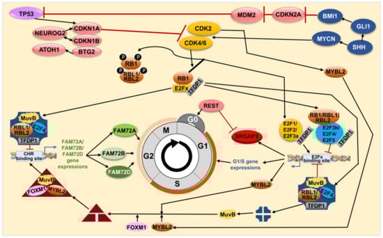 The DREAM complex interacts with the CHR element and E2Fx TFBSs to inhibit G1/S cell cycle gene expression until MuvB dissociates away to associate with MMB-FOXM1 to push the cell cycle into the G2/M phase [75,76]. During quiescence and early G1 phase of the cell cycle, the DREAM–MuvB complex represses cell cycle-promoting gene expression. When the stages end, it becomes deactivated, while the MuvB complex dissociates away to associate with v-myb avian myeloblastosis viral oncogene homolog-like 2 (MYBL2) and FOXM1, forming the MMB–FOXM1 complex. This new complex promotes late cell cycle gene expression and is required to pass through the G2/M phases [80]. FOXM1 gets phosphorylated during the M phase and regulates the expression of several cell cycle genes such as cyclin B1 (CCNB1) and cyclin D1 (CCND1). It is a crucial TF also found in fostering GBM development and progression by regulating key factors involved in cell proliferation, epithelial to mesenchymal transition (EMT), invasion, angiogenesis, and upregulating WNT1/β-catenin signaling [89].