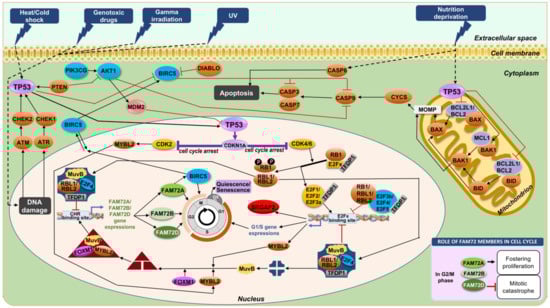 In another scenario, FAM72 expression was regulated by both DREAM and MMB–FOXM1 complexes under the control of TP53, particularly in cancer cells [75,76]. Through inhibition of cyclin-dependent kinase (CDK) activity by the CDK inhibitor 1A (encoded by CDKN1A), FAM72A and FAM72D were downregulated by TP53 in response to DNA damage via interfering with the DREAM and MMB-FOXM1 complex binding via the CHR BS motifs on the IGR. This prevents the FAM72A and FAM72D expressions, respectively, thus confirming FAM72A and FAM72D as G2/M-phase-promoting cell cycle genes (Figure 5 and Figure 7) [75].