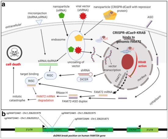 (a) Mechanisms of FAM72 knockdown using RNAi and CRISPR for the possible treatment of various types of cancer. Exogenous double-stranded RNA (dsRNA) or siRNA can be delivered via microinjection or lipid nanoparticles. The dsRNA or siRNA is released from the endosome after which it binds to the RNA-induced silencing complex (RISC). This complex then binds to the FAM72 mRNA, leading to the degradation of the whole complex. If shRNA is delivered via plasmid or viral vectors, the RNA is processed in the nucleus and exported into the cytoplasm. The Dicer enzyme processes shRNA into siRNA and then binds it to the RISC, followed by loading onto the target mRNA, and the resulting complex is degraded as before. Alternatively, the CRISPR-dCas9 with a transcriptional repressor protein is delivered via lipid nanoparticles. After entering the endosome, the CRISPR-dCas9 complex is released and it enters the nucleus. The Cas9 nuclease is directed to the target DNA by its bound sgRNA. Following binding of the dCas9 complex with the FAM72 target DNA, the repressor will attach to the transcriptional start site of FAM72, thereby resulting in a knockdown of transcription and thus, prevention of spindle formation causing mitotic catastrophe followed by cell death. ASOs delivered into the cell binding directly to the mRNA transcript, resulting in RNAse degradation. Cas, CRISPR-associated proteins; CRISPR, clustered regularly interspersed short palindromic repeats; dCas9, nuclease deficient Cas9; dsDNA/RNA, double stranded DNA/RNA; KRAB, Kruppel-associated box; sgRNA, single guide RNA; shRNA, short hairpin loop RNA; siRNA, small interfering RNA. (b) Double-strand break positions of CRISPR/Cas9 application on the human FAM72A gene. The sgFAM72A#1, sgFAM72A#2, sgFAM72A#3, sgFAM72A#4 have been used to target and break within exon 1 of FAM72A to interrupt FAM72A gene transcription. sgFAM72A, single guide FAM72A: target DNA positions to be recognized and cleaved by the CRISPR/Cas9 system for FAM72A gene expression knockout.
