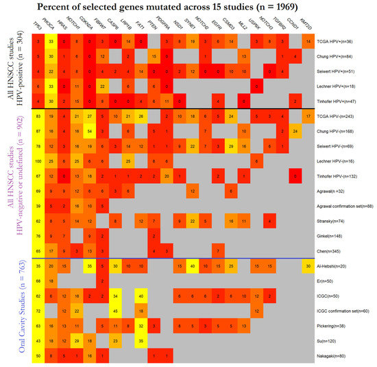Summary of Squamous cell carcinomas of the head and neck (HNSCC) gene mutations reported in 15 previous studies [16,17,18,19,20,21,22,23,24,25,26,27,28,29,30], stratified by human papilloma virus (HPV) status as available. Studies dedicated to oral squamous cell carcinomas (OSCC) are shown separately. Percentage of patients with a gene mutation are shown; red indicates low percentages and yellow indicates high percentages. Grey boxes indicate that no data were available for that gene for a particular publication.