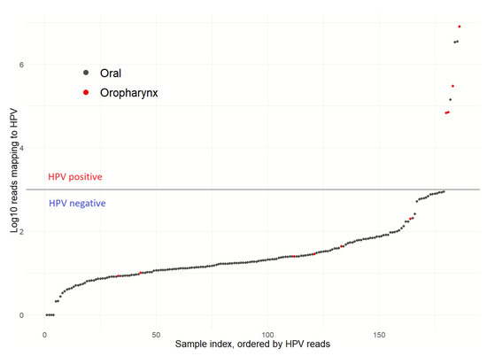 HPV detection. Read counts mapping to viral sequences were normalised against library size. Samples with post-normalisation read counts for any single HPV subtype of greater than 1000 were considered to be HPV-positive.