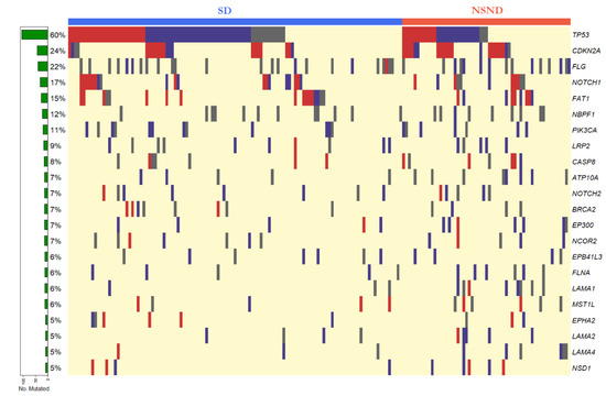 Mutation map for 23 candidate genes mutated in at least 5% (9/176) of tumours from OSCC patients. Nonsense and indel mutations are indicated by red bars, missense mutations with a PolyPhen-2 score > 0.85 are indicated by purple bars, missense mutations with a PolyPhen-2 score < 0.85 indicated by grey bars. The row at the bottom indicates patients with no detected mutations in the targeted sequencing panel. The colour bar at the top denotes smokers and/or drinkers (SD, blue) and non-smokers and non-drinkers (NSND, red).