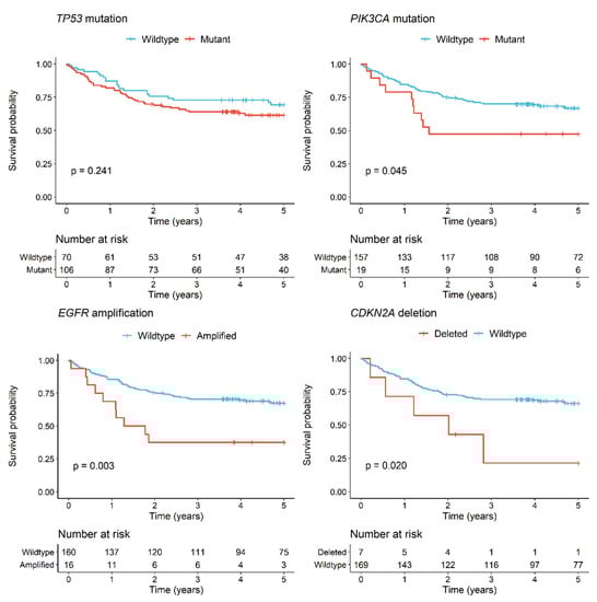 Kaplan–Meier survival curves for OSCC patients by TP53 mutation, PIK3CA mutation, EGFR amplification, or CDKN2A deletion status. p values are for the log rank test.