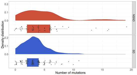 Distribution of mutation counts, comparing the NSND and the SD groups. NSND = non-smoker and non-drinker; SD = smokers and/or drinker.