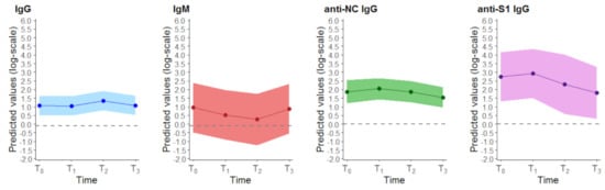 Figure 1 depicts the S/Co time trend profiles of IgG, IgM, anti-NC and anti-S1IgG, respectively, by considering only subjects with a positive T0 result (n = 18, 6, 18 and 7 for IgG, IgM, anti-NC and anti-S1 IgG, respectively).