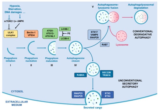 Representation of conventional degradative autophagy and unconventional secretory autophagy. Stress conditions such as hypoxia, starvation or DNA damages drive the activation of autophagic flux by inhibiting mTORC1 activity, correlating with an increased activity of AMPK, which activates the successive complexes that operate in order to initiate and complete the formation of autophagosomes. Once the autophagosome closed with the help of LC3B, two pathways exist. First, they can fuse with a lysosome with the help of RAB7, STX17, VAMP8 and SNAP29 in order to degrade its cargo. Alternatively, they can take the direction of the plasma membrane helped by RAB8A, SEC22B and TRIM16 for their transport and by SNAP23, SNAP29, SXT3 and STX4 for their fusion with the cell membrane.0.