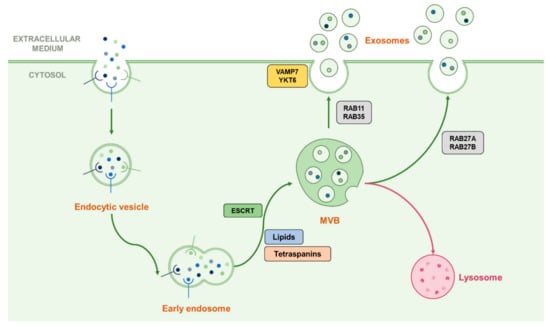 Once MVBs are formed, they require transport toward the cell membrane in order to release exosomes in the case of secretory vesicles, or toward the lysosome for the degradation of their cargo. Such transport involves the small Rab-GTPases family which is known to be implicated in vesicular trafficking processes, here notably represented by Rab7, 11, 27A/B and 35, which both play a different role in exosome fate [14,28,29,30]. For example, Rab7, which is known for transport toward the lysosome in autophagy machinery, also operates in the regulation of the secretion of exosomes containing syndecan and syntenin in breast cancer cells but not in HeLa cells [29,31]. Rab11 was shown to promote the fusion of MVBs with each other (homotypic fusion) and is often associated with Rab35 in early endosomal recycling processes [30,32]. Rab27A and Rab27B, which are known for their late endosomal recycling ability, have also been shown to play both common and different roles by providing MVB docking to the cell membrane depending on the cell type [29,33]. After the transport of MVBs to the cell membrane, they fuse with each other through the action of SNARE proteins such as VAMP7, shown as implicated in this process in leukemic cells, or YKT6 which operates in the secretion of Wnt proteins-containing exosomes [14,28,34,35]. Since those many actors play different roles in different steps of the exosomal secretion process, which seem to be specific according to the cell type, this may partly explain the variation of their content [26]. This machinery is summarised in Figure 2.