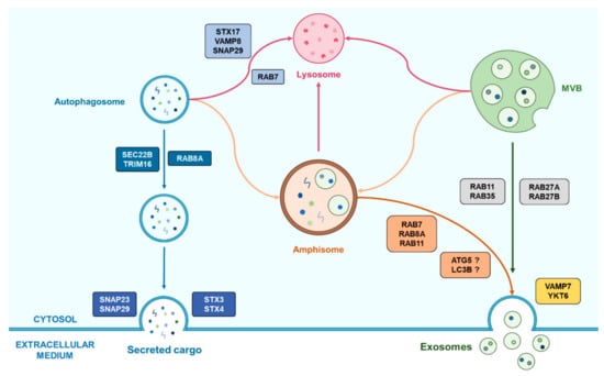 Among the different organelles and structures that intervene in each pathway, amphisomes appear as real crossroads between autophagy (more particularly secretory autophagy) and EV biogenesis and release. Amphisomes were initially considered as exclusive degradative organelles. For instance, increased autophagy under stress conditions or Bafilomycin A treatment, leading to increased autophagosome-MVBs fusion, was associated with fewer secreted exosomes in erythroleukemic cells, suggesting an autophagic recycling of MVBs instead of their release, thus supporting the close relationship between autophagy and exosome release via amphisomes [13,104]. Also, alteration in exosome biogenesis could be restored after autophagy inhibition, supporting the hypothesis that MVBs can be recycled in a lysosome-dependent manner rather than giving rise to exosomes release [79]. However, amphisomes were also shown to participate in non-degradative mechanisms as the previously described intervention of the autophagy proteins LC3B and ATG5 in the secretion of Annexin A2-containing exosomes requires the fusion of amphisomes with the plasma membrane [12]. Similarly, amphisomes were shown to be involved in a secretory pathway for mucin-containing vesicles in murine intestinal cells, requiring the intervention of LC3B, RAB7 and RAB11, thus supporting a potential secretory role for amphisomes fate [105]. Some points remain uncertain regarding the fate of autophagosomes toward a fusion with lysosomes or MVBs. Indeed, the secretion of IL-1β requires the fusion of autophagosomes with MVBs, supporting the unconventional autophagy-dependent secretory pathway model proposed by Dupont et al. [71] (while it was not determined if such a fusion led to the formation of an amphisome) [105].