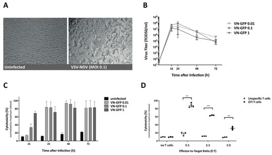 Infection of B16-OVA cells by virotherapy (VSV-NDV) and targeted cytotoxicity by T cells (OTI). (A) B16-OVA cells were infected with VSV-NDV at MOI 0.1 (right panel) or left uninfected (left panel), and images were captured 16-h post-infection. Representative images demonstrating characteristic syncytia formation in the infected well and the healthy uninfected monolayer were captured at 200× magnification. (B) B16-OVA cells were seeded and infected with VSV-NDV (VN) at different MOIs. Virus titers were determined via a TCID50 assay from tissue culture supernatants collected at indicated times after infection. (C) Corresponding cytotoxicity analysis was determined via an LDH detection assay and normalized to a maximum release control. (D) The cytotoxic effector function of OTI T cells on B16-OVA melanoma cells was determined by LDH assay. Cells were co-cultured with OTI or unspecific control T cells for 24 h in the indicated effector-to-target ratios. T cells were isolated from the spleens of OTI or C57Bl6 mice and expanded in vitro before addition to the co-culture. Additional wells of B16-OVA cells were left without the addition of T cells, in order to demonstrate the baseline level of cytotoxicity. All data are presented as mean + SEM of triplicate experiments, and statistical significance was determined by student’s t-test (** p < 0.01, *** p < 0.001).