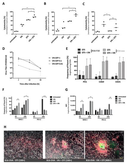 In vitro effects of VSV-NDV and OTI T cell combination therapy. Co-culture experiments were performed by seeding B16 cells and pre-infecting them with VSV-NDV (VN) at MOI 0.1 for 8 h, before adding OTI T cells in a 1:1 effector-to-target ratio. Supernatant samples were collected (A) at 8 h after OTI addition to B16-OVA cells or (B) 16 h after OTI addition to a 1:1 mixed B16 melanoma (B16-OVA: B16-F10) cell population to determine cytotoxicity by LDH assay. (C) Additional co-culture experiments were performed using B16-F10 cells pre-infected with VSV-NDV for 24 h prior to addition of OTI cells and collecting supernatant for LDH assay 16 h later. (D) OTI T cells were infected with VSV-NDV at the indicated MOIs, and supernatant samples were collected 2, 24 and 48 h after infection for virus titer determination by TCID50. (E) OTI T cell activation in response to co-culture with/without VSV-NDV pre-infection in B16-OVA and B16-F10 cells was determined by measuring surface expression of PD1, CD69, and CD25 via flow cytometry. Co-culture experiments were performed by seeding B16 cells, pre-infecting them with VSV-NDV (VN) at MOI 0.01 for 16 h before adding OTI T cells (OTI) in a 1:1 effector-to-target ratio. Cells were harvested 24 h after T cell addition and stained for flow cytometric analysis, or (F) tumor cells were harvested 6 and 24 h after OTI addition and stained for flow cytometric analysis of MHC-I and PD-L1 expression. (G) Mean fluorescence intensity (MFI) was determined from the same samples. All data are presented as mean + SEM of triplicate experiments, and statistical significance was determined by student’s t-test (* p < 0.05, ** p < 0.01, *** p < 0.001). (H) Labeled OTI T cells were used in co-culture experiments to visualize accumulation around VSV-NDV-induced syncytia. B16-OVA cells were treated with PBS (left panel) or infected with VSV-NDV-GFP at MOI 0.01 for 16 h (middle and right panel), and OTI T cells labelled with FarRed CytoTrace (ThermoFischer) were added. Representative pictures were taken 4–6 h later under 100× (left and middle) or 400× (right) magnification. Composites were generated using ImageJ.