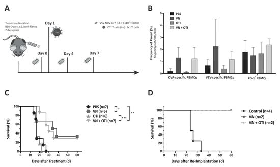 Based on the promising in vitro results, the combination therapy approach was then analyzed in vivo for the treatment of subcutaneous murine melanoma. The experimental set-up for survival analysis is illustrated in Figure 3A. To examine potential differences in circulating immune cells in response to the treatments, blood was collected on day 16 after initiation of treatment. Flow cytometric analysis of PBMCs confirmed that both VSV-NDV treatment alone, as well as in combination with OTI, tend to induce the presence of OVA-specific CD8+ T cells in the periphery, compared with PBS treatment (Figure 3B, left). An increase in VSV-specific CD8+ T cells could also be observed in both treatment groups receiving VSV-NDV, although there is a possible (non-significant) decrease in the combination group (Figure 3B, middle). PD-1 expression on peripheral CD3+ lymphocytes appear to be unaffected, regardless of treatment (Figure 3B, right); however, the PD-1 expression on tumor infiltrating lymphocytes is likely to be different than what is observed on PBMCs. Tumor growth was monitored regularly, and animals were sacrificed as soon as one tumor reached 15 mm in diameter. VSV-NDV, both alone and in combination with OTI T cells, resulted in significant survival prolongation compared to PBS or OTI monotherapy (Figure 3C). To evaluate the long-term protection of the anti-tumor immune response induced by combination therapy, surviving mice were subjected to re-challenge with B16-OVA cells, implanted subcutaneously. As a control, the same tumor cells were similarly implanted in naïve age- and sex-matched control mice. While the naïve mice quickly succumbed to tumor growth as expected, the survivors remained tumor-free and showed no sign of tumor growth over the duration of the experiment (Figure 3D), indicating the formation of a memory response. However, it should be noted that there were only 2 long-term surviving mice in each treatment group that could be used in the re-challenge experiment, and there were no observable differences between the tumor rejection in those mice that had previously received VSV-NDV alone compared to those receiving combination therapy, indicating that both groups seemed to be equally protected from tumor re-challenge in this experiment.