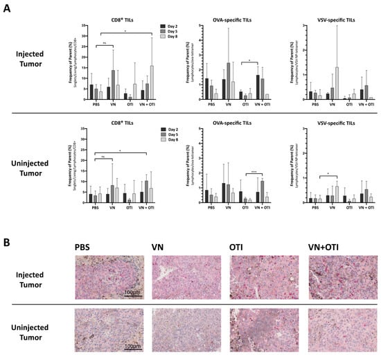 Features of tumor infiltrating lymphocytes in the injected and uninjected tumor. (A) Mice were subcutaneously implanted with 2.4 × 105 B16-OVA cells on both flanks. One week later, the mice were randomly distributed into indicated treatment groups (n = 3–6) and injected intratumorally with VSV-NDV (VN) at a dose of 107 TCID50 or PBS in an equal volume of 50 µL on day 0, followed by an intravenous OTI T cell injection (5.5 × 106) on day 1 for combination treatment or OTI monotherapy. Tumors from both flanks were harvested on day 2, 5 and 8 after the first treatment. Single cell suspensions were generated from tumor tissues, and tumor infiltrating lymphocytes (TILs) were analyzed for CD8 surface expression and OVA- or VSV-specificity via flow cytometry. Data are presented as mean + SD, and statistical significance was determined by student’s t-test (* p < 0.05, *** p < 0.001). (B) Paraffin-embedded tumor sections of 2 µm in thickness were subjected to immunohistochemical analysis using antibodies specific for mouse CD8 and visualized using a fast red chromogen for detection. Representative sections of injected (top panel) or uninjected (bottom panel) tumors from the indicated treatment groups were captured at 200× magnification. Scale bars indicate 100 µm.