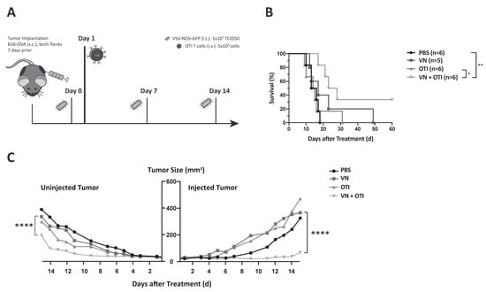 Benefits of combination therapy are highlighted in a modified dosing scheme. (A) Experimental set-up of the adapted survival experiment. C57BL6/J mice were implanted with 2.4 × 105 (injected tumor) and 1.2 × 105 (uninjected tumor) B16-OVA cells subcutaneously on contralateral flanks. One week later, mice were randomly distributed into treatment groups (n = 5–6) and injected intratumorally with VSV-NDV at a dose of 107 TCID50 or PBS in an equal volume of 50 μL on day 0, followed by an intravenous OTI T cell injection (5.5 × 106) on day 1 for combination treatment or OTI monotherapy. Intratumoral virus or PBS injections were repeated on day 7 and 14. (B) Survival of the different treatment groups was monitored and plotted in a Kaplan–Meier curve. Statistical significance was determined by log-rank test (* p < 0.05, ** p < 0.01). (C) Tumor growth was monitored by caliper measurements of tumor width and length. The volume was calculated according to the modified ellipsoid formula: Tumor volume = 1/2(length × width2). Mean tumor volume was plotted up to day 14 for uninjected and injected tumors according to the indicated treatment groups. Statistical significance was determined by student’s t-test (**** p < 0.0001).