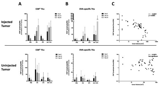 Treatment effects of tumor infiltrating lymphocytes in the injected and uninjected tumor. Mice were subcutaneously implanted with 2.4 × 105 (injected tumor) and 1.2 × 105 (uninjected tumor) B16-OVA cells subcutaneously on contralateral flanks. One week later, mice were randomly distributed into indicated treatment groups (n = 5) and injected intratumorally with VSV-NDV (VN) at a dose of 107 TCID50 or PBS in an equal volume of 50 µL on day 0, followed by an intravenous OTI T cell injection (1 × 106) on day 1 for combination treatment or OTI monotherapy. Virus/PBS treatment was repeated on days 7 and 14. Tumors from both flanks were harvested on day 8, 15 and 22 after the first treatment. Single cell suspensions were generated from tumor tissues, and lymphocytes were isolated by gradient centrifugation. Tumor infiltrating lymphocytes (TILs) were then analyzed for CD8 surface expression (A) and OVA-specificity (B) via flow cytometry. Cell counts were normalized to tumor size measured before harvesting. Data are presented as mean + SD, and statistical significance was determined by student’s t-test. (C) Tumor size was correlated with OVA-specific T cell infiltration in a nonparametric Spearman correlation using GraphPad.