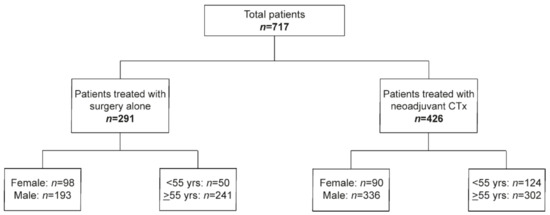 For age dichotomization, the cut off at 55 years was chosen to address possible differences regarding the pre- and postmenopausal stage. The study population including the number of males and females and the number of patients <55 and ≥55 years in the GC cohort without and after CTx is shown in Figure 1.