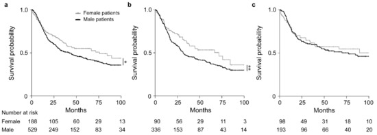 Discrimination of patients’ survival by sex. Kaplan–Meier curves of female or male patients are shown. All GC patients (a), patients treated with neoadjuvant CTx (b) and patients treated with surgery alone (c). * p = 0.035, ** p = 0.054, Cox-regression.