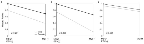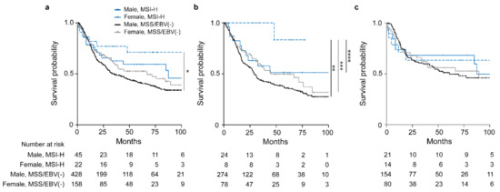 Comparison of OS between males and females with the respective MSI-H and MSS/EBV(−) tumors revealed a statistically significant difference (overall p = 0.031). The female MSI-H group showed the best OS (HR, 0.39; 95% CI, 0.18–0.89, p = 0.024) followed by the male MSI-H group (HR, 0.69; 95% CI, 0.43–1.11, p = 0.126) and the female MSS/EBV(−) group (HR, 0.79; 95% CI, 0.61–1.04, p = 0.095) taking the male MSS/EBV(−) group as reference (Figure 3a, Table 3).