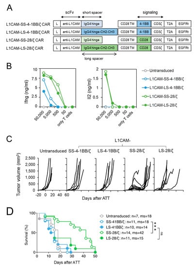 Chimeric antigen receptor (CAR) T cell therapy is a promising clinical approach in cancer treatment where patients’ own T cells are engineered to express a synthetic receptor that redirects specificity towards recognizing and killing cancer cells. First-generation CAR design contained an extracellular antibody-derived antigen-binding domain (scFv) and a single intracellular CD3ζ signaling domain connected via an extracellular spacer and transmembrane domain. Due to limited efficacy in clinical trials, one (second generation) or two (third generation) co-stimulatory signaling domains (most often CD28 or/and 4-1BB) were added to improve CAR T cell persistence and, hence, effector functions [1,2,3]. While CARs implementing CD28 co-stimulation demonstrated brisk and strong effector function, 4-1BB signaling resulted in slower but more durable T cell responses [4]. Here, we use CAR T cells targeting the glycosylated CE7 epitope of the L1 cell adhesion molecule, L1CAM (formerly CD171), which is specifically expressed on tumor cells and a promising target for neuroblastoma and ovarian cancer [5,6,7]. Neuroblastoma is the most common extracranial solid tumor in childhood and remains the third leading cause of pediatric cancer death despite multimodal therapies [8,9]. Recently, children diagnosed with refractory neuroblastoma were treated with L1CAM-targeting CAR T cells harboring the 4-1BB co-stimulatory domain in a clinical phase I trial (NCT02311621, Available online: https:clinicaltrials.gov (accessed on 1 March 2021)).