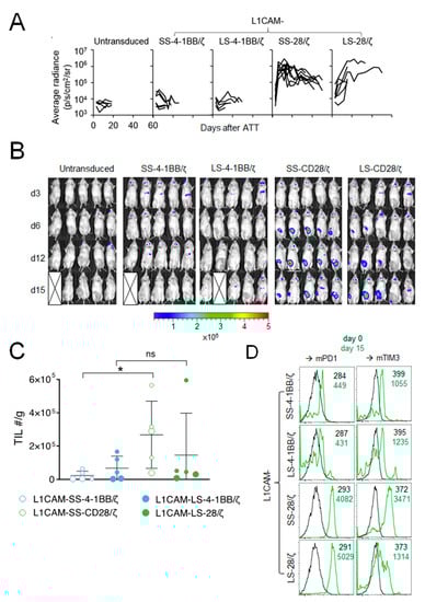 The CD28 signaling domain enables L1CAM-specific CAR T cells with short and long spacer to expand at the tumor site. (A) Kinetic of the T cell signal (average radiance) detected at the tumor site over time is shown for mice from Figure 1C (L1CAM-SS-4-1BB/ζ (n = 6), L1CAM-LS-4-1BB/ζ (n = 5), L1CAM-SS-28/ζ (n = 9), L1CAM-LS-28/ζ (n = 6), untransduced (n = 5)). (B) Bioluminescent imaging data of mice shown in (A) on indicated time points following treatment (5 representative mice are shown for each group). The pseudo color scale indicates the intensity of the signal and is set from minimum 2 × 105 to maximum 5 × 106 p/s/cm2/sr. Data are representative of two independently performed experiments. (C) Mice were treated as described in (A) and were sacrificed on day 15. Tumors were harvested, T cells extracted and quantified. Total numbers (#) of TILs/g of tumors are depicted. Larger circles represent TILs of mice analyzed in (D). (D) TILs isolated from two mice of each treatment group shown in (C) were analyzed by flow cytometry for Pd1+ and Tim3+ expression and expression levels were compared to CAR T cells before infusion (d0). Black and green numbers within the graphs present mean fluorescent intensity (MFI) values of T cells before infusion and TILs isolated on day 15, respectively. Error bars represent SD, ns = not statistically significant *, p ≤ 0.05; TIL = tumor infiltrating lymphocytes.