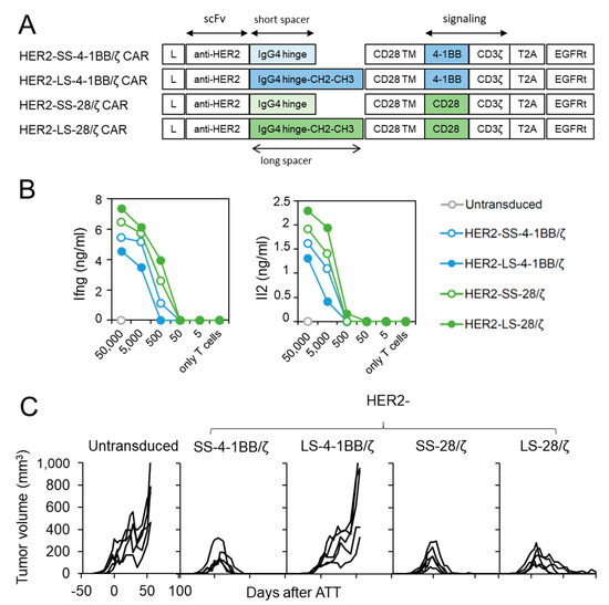 - Hudecek, M.; Sommermeyer, D.; Kosasih, P.L.; Silva-Benedict, A.; Liu, L.; Rader, C.; Jensen, M.C.; Riddell, S.R. The nonsignaling extracellular spacer domain of chimeric antigen receptors is decisive for in vivo antitumor activity. Cancer Immunol. Res. 2015, 3, 125–135. [Google Scholar] [CrossRef]