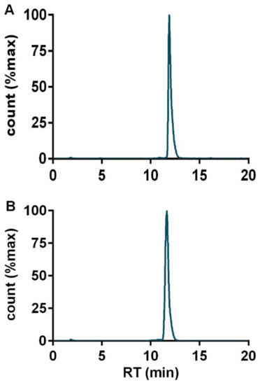 HPLC profiles of [177Lu]Lu-NeoB performed (A) immediately following radiolabeling and (B) 24 h after radiolabeling.