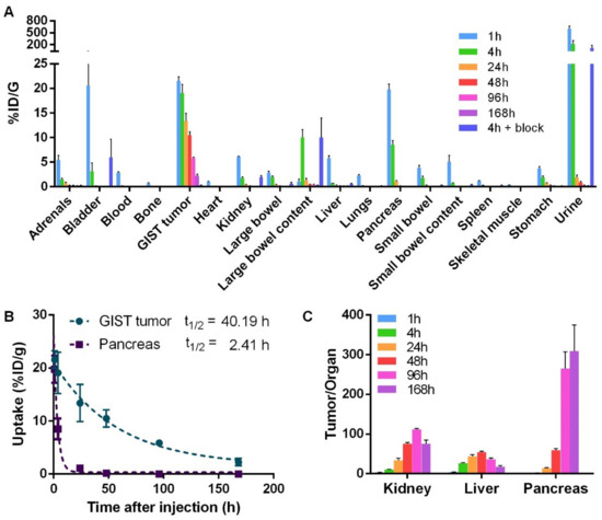 Biodistributions of [177Lu]Lu-NeoB were performed on GIST tumor bearing mice at different time after injection (Figure 2A, Table S1). At 1 h post-injection (pi), [177Lu]Lu-NeoB uptake was greater than 2% ID/g in most investigated tissues. Among those tissues, the uptake was greater than 10% ID/g in the urine (600.2 ± 155.3 % ID/g), the bladder (20.6 ± 19.7% ID/g), the GIST-882 tumor (21.6 ± 1.7% ID/g), and the pancreas (19.8 ± 2.6% ID/g). At 4 h pi, [177Lu]Lu-NeoB uptake remained greater than 10% ID/g in the urine (215.5 ± 192.9%ID/g), the GIST tumor (19.1 ± 3.9% ID/g) and the large bowel content (10.0 ± 3.5% ID/g). At this 4 h-time point, when co-injected with an excess of unlabeled NeoB, [177Lu]Lu-NeoB uptake was significantly reduced in the adrenals, blood, GIST tumor, large and small bowel, pancreas, and stomach (p < 0.05). The most profound decrease (> 98%) was observed in the GIST tumor (0.3 ± 0.1 vs 19.1 ± 3.9% ID/g) and the pancreas (0.1 ± 0.0 vs 8.5 ± 2.0% ID/g) (Figure 2A), indicating GRPR specificity. From 24 h to 168 h pi, [177Lu]Lu-NeoB uptake was lower than 2% ID/g in all investigated tissues with the exception of the GIST tumor. Indeed, tumor uptake was of 13.4 ± 3.5% ID/g, 10.5 ± 1.6% ID/g, 5.9 ± 0.3% ID/g and 2.5 ± 0.7% ID/g at 24 h, 48 h, 96 h, and 168 h, respectively (Figure 2A, Figure S1). [177Lu]Lu-NeoB retention in the tumor was therefore elevated in comparison to that of other tissues such as pancreas with a half-life of 40.2 h (Figure. 2B). Accordingly, tumor-to-kidney, tumor-to-liver, and tumor-to-pancreas ratios were found to be greater than 1 at all investigated time points with a maximum value at 96 h for the tumor-to-kidney ratio (112 ± 5), at 48 h for the tumor-to-liver ratio (54 ± 5), and at 168 h for the tumor-to-pancreas ratio (309 ± 148) (Figure 2C).