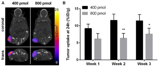 In vivo distribution of [177Lu]Lu-NeoB in Gastrointestinal Stromal Tumor (GIST) bearing mice. (A) Representative SPECT/CT images acquired 24 h following the injection of 400 pmol (left) or 800 pmol (right) [177Lu]Lu-NeoB. SPECT was corrected from background and decay and scaled from 0 to 25% ID/g. (B) Quantification of [177Lu]Lu-NeoB tumor uptake on SPECT images determined at day 1 after injection on week 1, 2, and 3. Results are expressed in % ID/g. * p < 0.05, ** p < 0.01 vs. 400 pmol group.