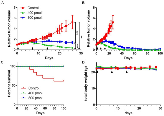 Effect of [177Lu]Lu-NeoB on tumor growth. Mice bearing GIST-882 tumor were injected once a week for three weeks with 37 MBq of 400 pmol or 800 pmol of [177Lu]Lu-NeoB or with saline (control). Tumor volume was expressed relatively to the volume measured at the time of the first injection (A,B). At early time points (0–26 days) tumor volume were evaluated on all 40 mice (A,B). At later time points (28–100 days), 5 control mice out of 13 were removed from the follow up at the time their tumor reached the limit volume size of 1500 mm3, so that control group curve is no longer represented on the graphics (B) (individual curves are available in Figure S1). (C) Percent of survival without reaching the limit tumor volume. (D) Total body weight of mice. Data are represented as mean ± SEM. ** p < 0.01, *** p < 0.001.